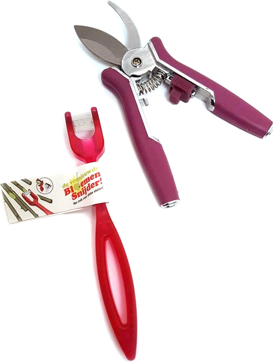Bloemensnijder en snoeischaar kleintje knip. Altijd makkelijk. Past in elke keukenla. spreekt deze set je aan? Of wil je deze set iemand cadeau doen? De bloemensnijder ligt goed in de hand en de stelen snij je in een handomdraai schuin al. De schuine gesneden stelen zijn belangrijk om goed het water te kunnen opnemen, zo heb je langer plezier van je bloemen. De kleine snoeischaar is 15 cm lang en super makkelijk, ligt goed in de hand en is scherp. De dikkere takken zijn zo doorgeknipt. Door het kleine formaat past de snoeischaar met gemak in de keukenla.