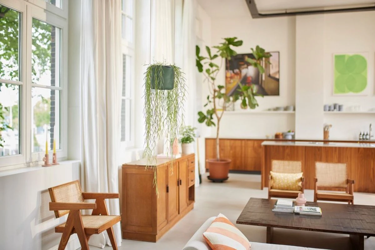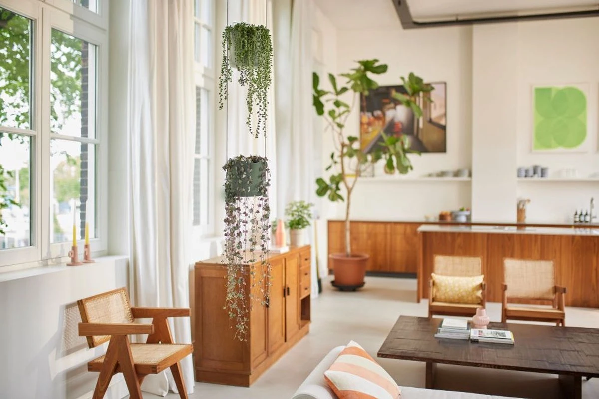 Deze bloempot komt met een hangsysteem in een moderne stijl. De hang bloempot is met twee touwtjes te bevestigen aan het plafond en komt in twee maten; 50cm en 70cm. Je bepaalt dus hoe hoog je jouw nieuwe bloempot hangt. Daarnaast is deze verticale bloempot uitgerust met oortjes. Hierdoor kun je nog een b.for swing eronder hangen, wat zorgt voor een speels effect en nog meer ruimte om te vergroenen!