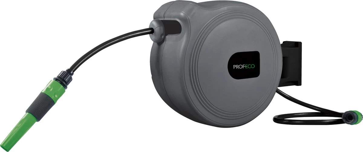 Deze Profeco wandslangenbox, ook wel muurhaspel of tuinslanghaspel genoemd, maakt het water geven aan bloemen en planten net even gemakkelijker. Uw tuin bewateren? Met deze semi-automatische Profeco tuinslangbox gaat dat uiterst eenvoudig. De wandbox is voorzien van een geintegreerde haspel, waarvan u de tuinslang eenvoudig uitrolt en na gebruik weer automatisch in de box laat rollen. De wandbox monteert u eenvoudig aan een muur, schutting of paal in uw tuin. Zeer geschikt om planten, bloemen en struiken efficiënt en gemakkelijk te bewateren. Het bereik van de tuinslang is bovendien ruim door een lengte van 15 meter en de 180 graden draaimogelijkheid van de wandbox. De tuinslang rolt zichzelf na gebruik automatisch op. U kunt de wandbox van de beugel afhalen en zo eenvoudig vorstvrij en veilig bewaren. De meegeleverde Profeco tuinspuit is bovendien traploos verstelbaar van een lichte mist tot een krachtige straal.
